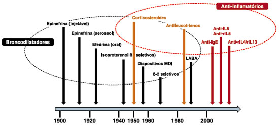 A asma é um bom exemplo de como o tratamento das enfermidades imunoalérgicas têm evoluído. Primeiramente, o principal objetivo do tratamento da asma era aliviar o broncoespasmo, facilitando o fluxo de ar pelas vias aéreas; foram desenvolvidos broncodilatadores cada vez mais seletivos e de melhores características farmacocinéticas e farmacodinâmicas. Os dispositivos inalatórios também se tornaram mais eficientes. Porém, o grande avanço no tratamento da doença foi baseado no conceito de que subjacente ao broncoespasmo existe um processo inflamatório que precisa ser tratado. Os corticosteroides, um marco no tratamento da asma, mudaram a evolução natural da doença, inclusive de sua mortalidade. Mais recentemente, o advento dos imunobiológicos tem permitido o tratamento de pacientes com formas mais complexas e graves da doença (Figura 1).