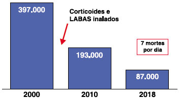 Nas últimas décadas, observamos redução de cerca de 75% no número de internações por asma; hoje é raro encontramos pacientes em unidades de terapia intensiva em decorrência de crises de asma. Entretanto, a mortalidade não diminuiu, e cerca de 7 pessoas ainda morrem diariamente pela doença (Figura 2). Há mais de um fenótipo de asma grave; algumas formas decorreriam de anos de tratamento inadequado da doença, mas outras apresentariam maior gravidade intrínseca. O uso de agentes biológicos é fundamental e muda o prognóstico nestes pacientes, permitindo o controle da doença, inclusive com a diminuição de internações por exacerbações e melhoria na qualidade de vida. Há evidências científicas abundantes mostrando a eficácia e segurança destas medicações. A tônica da discussão deve ser: custo, acesso, população-alvo, critérios de resposta terapêutica, critérios para retirada da medicação e criação de centros de referência.
