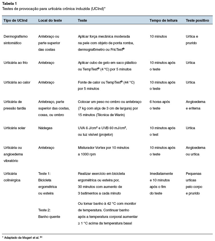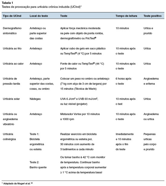 Em estudo recente na Turquia com 117 crianças com UCInd, o dermografismo sintomático foi o mais comum (65%), e teve melhor prognóstico quando comparado com outros subtipos de UCInd (40% de remissão em 5 anos). A urticária colinérgica foi o tipo com pior prognóstico, com dominância masculina e níveis basais de triptase sérica mais elevados23. No estudo de Miles e cols., a urticária ao frio e a colinérgica foram os subtipos mais frequentes22. Outros subtipos de UCInd, como a solar, pressão-tardia e aquagênica, foram menos comuns nos estudos com população pediátrica19,22,23. Os testes de provocação são realizados da mesma forma que nos adultos e estão listados na Tabela 1.