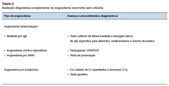 A abordagem diagnóstica do angioedema é igual em todas as idades, com ênfase nos medicamentos de uso contínuo e recorrente; duração, localização do angioedema e resposta ao tratamento; sinais e sintomas associados; história familiar de angioedema; exames laboratoriais e testes de provocação de acordo com a suspeita clínica (Tabela 2).