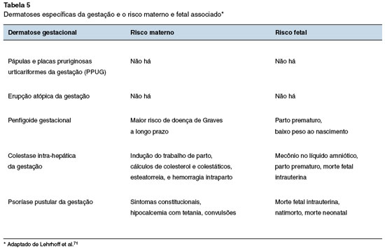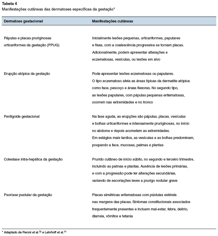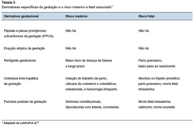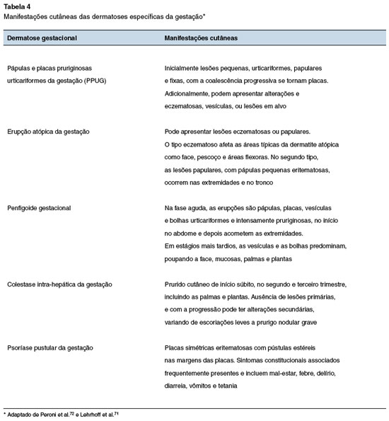 A gestação é um período caracterizado por alterações dermatológicas, com algumas dermatoses específicas desta condição, bem como o prurido sem lesão. A urticária até pode ocorrer durante, mas não é específica da gestação. As dermatoses da gestação são raras e não existem testes adequados para o diagnóstico, dificultando o seu manejo. As principais manifestações cutâneas e o risco materno-fetal das dermatoses da gestação estão descritas nas Tabelas 4 e 5, respectivamente11,60,71,72.