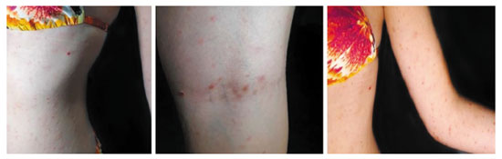 Paciente do sexo feminino, 20 anos, previamente hígida, comparece à consulta dermatológica ao notar o aparecimento de pápulas avermelhadas, não pruriginosas, em toda superfície corporal há cerca de uma semana e meia. O surgimento das lesões se deu após três dias da primeira dose da vacina contra o SARS-CoV-2 desenvolvida pela Sinovac (China) e produzida no Brasil pelo Instituto Butantan6. A CoronaVac® é composta pelo vírus inativado e uma solução de hidróxido de alumínio7. A vacina foi realizada pela injeção intramuscular em deltoide direito (0,5 mL). Paciente relatou que as lesões iniciaram de forma lenta no tronco, mas evoluíram rapidamente para as demais áreas do corpo. Destaca-se que as pápulas surgiram em regiões de menor exposição solar, como região interna e posterior dos membros. À análise clínica, confirma-se a presença de pápulas eritematosas (Figura 1). Somente na fossa poplítea se observou a presença de três lesões violáceas. Tal fato sugere que as lesões estavam em diferentes estágios de desenvolvimento. No tórax, notou-se lesões maiores com descamação em colarete. Para o controle das lesões, recomendou-se o uso de um creme manipulado com baixa concentração de desonida (0,05 mk) em 100 mL de loção hidratante, com aplicação de uma vez ao dia, mas sem resposta.
