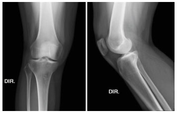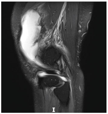 Foi submetida a exames laboratoriais, radiografia do joelho direito e ressonância nuclear magnética (RNM) no joelho e ombro direito. A radiografia apontou apagamento do coxim gorduroso suprapatelar, sugerindo reação sinovial (Figura 1). A RNM do joelho apontou acentuado derrame articular, pelo que, foi realizada punção do líquido articular (Figura 2). A análise do líquido apresentou 2.240 leucócitos por mm3, com 1.366 polimorfonucleares por mm3. As culturas e a bacterioscopia foram negativas. A RNM do ombro apontou derrame articular acromioclavicular e glenoumeral.