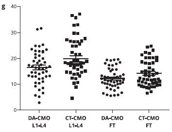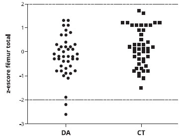A Tabela 3 mostra que o conteúdo mineral ósseo (CMO) foi menor nos pacientes com DA em comparaçao ao grupo controle na coluna lombar [16,5 (6,4) vs. (19,8 (8,3) g, p = 0,027] e no fêmur total [12,2 (4,00 vs. 14,4 (5,0) g, p = 0,029]. Além disso, a densidade mineral óssea (DMO) no fêmur total (p = 0,042) e o z-escore (p = 0,043) foram inferiores em pacientes com DA em comparaçao ao grupo controle (Figuras 1 e 2).