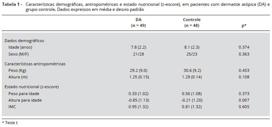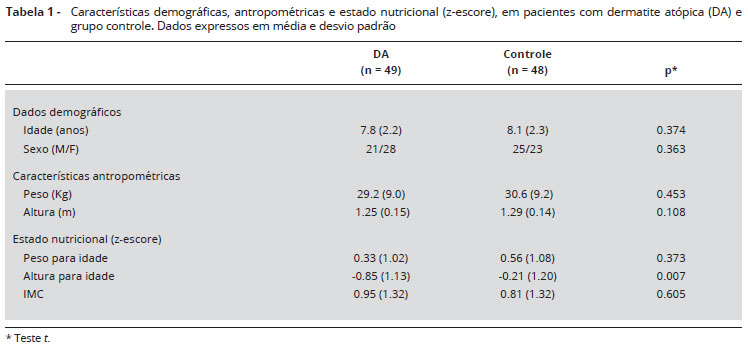 Existem poucos estudos avaliando o estado nutricional de crianças com dermatite atópica. O primeiro, realizado na Itália, com crianças menores de 4 anos de idade mostrou uma diferença significante no índice de altura para a idade, e crianças com DA foram menores quando comparadas com crianças saudáveis23. O segundo estudo foi realizado com 21 crianças, com idade média de 8,1 anos, com diagnóstico de DA moderada ou grave, mas nao foi encontrada nenhuma diferença significante no índice de altura para idade das crianças com DA em comparaçao ao grupo controle, mesmo quando relacionados com o uso de GC tópicos, sugerindo que o uso GC nao estava diretamente envolvido no crescimento destas crianças24.