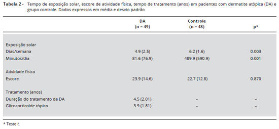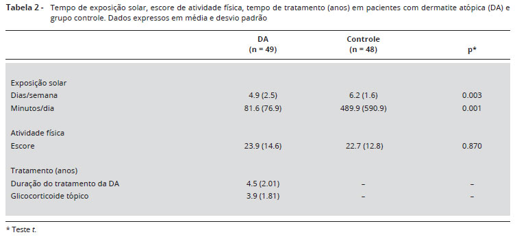 A Tabela 2 apresenta os resultados de exposiçao solar, atividade física e tempo de tratamento e de doença. O tempo de exposiçao solar foi menor em pacientes com DA do que no grupo controle, nos dois parâmetros analisados (p = 0,003 e p = 0,001). O escore de atividade física nao apresentou diferença significante entre os grupos (p = 0,870). A duraçao média da doença foi de 4,5 (2,01) anos, e o tempo de uso tópico de GC foi de 3,9 (1,81) anos. No momento da inclusao, os pacientes tinham doença de pele ativa, indicada por índice médio de SCORAD de 50,69 (18,07).