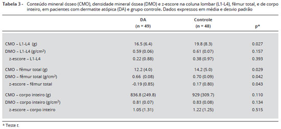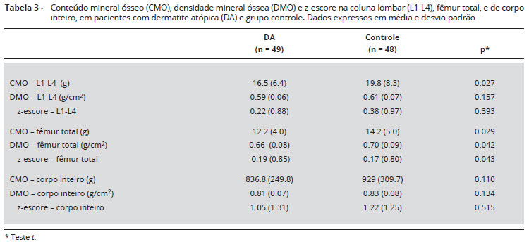 A coluna lombar tem o tipo de osso trabecular, enquanto o resto do corpo possui mais osso cortical. No presente estudo, encontrou-se menor conteúdo mineral ósseo na coluna lombar em crianças com DA. Este achado está de acordo com os estudos na literatura que analisaram a massa óssea de crianças com DA8,9. Os resultados de CMO, DMO e z-escore do fêmur total mostraram valores diminuídos nas crianças com DA em relaçao ao grupo controle, sugerindo que o osso cortical também pode ser afetado em doenças crônicas em que há necessidade de usar GC tópico por longo período3.