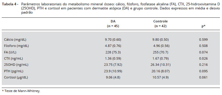 Embora existam poucos estudos sobre os efeitos adversos do uso prolongado de GC tópico, sabe-se que esta droga poderia influenciar o processo de remodelamento ósseo3,26. Na DA, GC tópicos sao a principal escolha para tratar as agudizaçoes do eczema. A quantidade de GC utilizado depende da frequência da exacerbaçao dos sintomas, e do número, extensao e gravidade das lesoes, bem como da potência do GC utilizado. Todos esses fatores podem influenciar os efeitos sistêmicos da droga. No presente estudo, foram incluídos os pacientes com doença moderada ou grave que faziam uso frequente de GC tópicos, e, portanto, estavam suscetíveis aos efeitos metabólicos do medicamento como a supressao do eixo hipotalâmico-pituitário-adrenal e sobre a massa óssea.