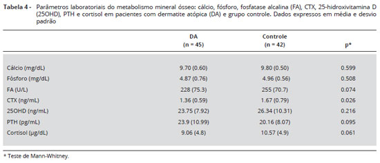 MÉTODOS: Quarenta e nove crianças com DA moderada ou grave (4-12 anos) e 48 crianças saudáveis foram avaliadas por z-escore altura/idade, z-escore peso/idade, z-escore IMC, duraçao e gravidade da doença, uso de Glicocorticoides (GC) tópico e parâmetros ósseos. Conteúdo mineral ósseo (CMO), densidade mineral óssea (DMO) e z-escores foram medidos por absormetria de dupla emissao de raios-X (DXA). Níveis séricos de cálcio, fósforo, fosfatase alcalina, cortisol e telopeptídeo carboxiterminal do colágeno tipo 1 (CTX), e níveis plasmáticos de 25 hidroxivitamina D (25OHD) e hormônio da paratireoide (PTH), foram determinados.