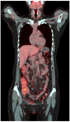 Quando a paciente procurou nosso serviço, ainda apresentava constante alteraçoes do hábito intestinal, odinofagia, cefaleia, lesoes eritematosas em face, mialgia em coxas e pernas e poliartralgia em ombros, punhos e tornozelos. A paciente negava perda de peso e se queixava de esquecimento e estresse emocional frequentes. Nao referia antecedente familiar de doenças autoimunes e neoplasias. O pai havia falecido por infarto agudo do miocárdio e a mae estava viva, com problemas cardíacos e vasculares. A paciente foi novamente internada para investigaçao. Neste momento a paciente apresentava leucocitose e neutrofilia, além de elevaçao de provas inflamatórias de fase aguda. Para que causas infecciosas, inflamatórias ou neoplásicas fossem excuídas, foi realizado PET-Scan (tomografia por emissao de pósitrons) de corpo inteiro (Figura 1). A partir desta imagem foi realizado colonoscopia para se descartar doença inflamatória intestinal. Com a ausência de alteraçoes na colonoscopia e por nao haver causa infecciosa ou neoplásica que justificassem o quadro da paciente, foi aventada a hipótese de doença autoinflamatória sistêmica, provavelmente febre familiar do Mediterrâneo e introduzido empiricamente colchicina na dose de 1,5 mg/dia. Após dois dias de tratamento, houve normalizaçao do quadro clínico e das provas inflamatórias (Tabela 1).