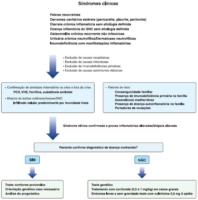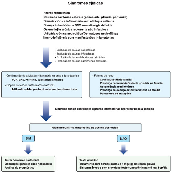 A Figura 2 resume o manejo diagnóstico das doenças autoinflamatórias, modelo que foi utilizado no caso apresentado e pode guiar os médicos que suspeitam dessas doenças. Inicialmente, deve-se caracterizar a síndrome clínica do paciente, excluindo causas infecciosas, neoplásicas, imunodeficiências primárias e doenças autoimunes clássicas. Exames laboratoriais que evidenciem aumento de atividade inflamatória, principalmente na crise, como PCR, VHS, ferritina e substância amiloide, sao muito importantes, além da confirmaçao histopatológica de infiltraçao inflamatória neutrofílica em lesoes de pele, osso e sistema nervoso central.