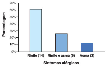 Estudamos 43 pacientes com idade compreendida entre 18 a 71 anos (mediana 48 anos), e predomínio do sexo feminino (77%). Grande parte (53%) dos pacientes estudados apresentavam sintomas alérgicos, sendo rinite a mais prevalente (61%), seguida de asma e rinite (26%) e asma (13%), elucidado na Figura 1.