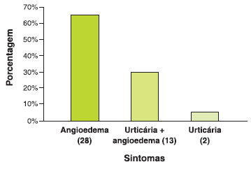 Os sintomas relatados pelos pacientes foram: angioedema (65%), urticária e angioedema (30%) e somente urticária (5%). Desses pacientes, somente 1 (2%) apresentava antecedente de anafilaxia (Figura 2). Neste paciente com anafilaxia, o fármaco implicado foi a dipirona.