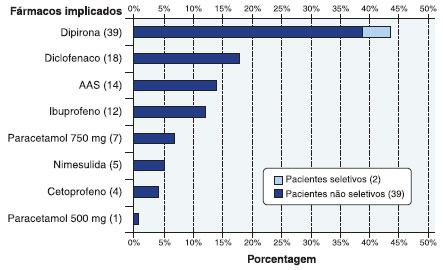 A maioria dos pacientes estudados foi classificada como nao seletivo, por apresentar reaçoes a múltiplos AINES, provavelmente por inibiçao da COX-1, e, dentre os fármacos implicados, destacaram-se as pirazolonas (ex: dipirona), diclofenaco, AAS e ibuprofeno. Diferente dos nossos resultados, Sanches-Borges e Di Leo encontraram predomínio do AAS, seguido das pirazolonas1,11,12. Possivelmente esta discordância ocorre pela facilidade em adquirir as pirazolonas, especialmente a dipirona em nosso país.