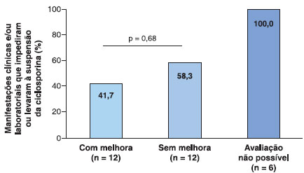 No presente estudo, apenas 12 pacientes (40%) apresentaram boa resposta terapêutica à ciclosporina, outros 12 pacientes (40%) nao responderam ao tratamento e em 6 pacientes (20%) nao foi possível a avaliaçao, pois, 3 pacientes apresentavam alteraçoes renais ou hipertensao arterial previamente à introduçao do medicamento e outros 3 apresentaram efeitos colaterais logo após a introduçao da medicaçao (antes de 30 dias).