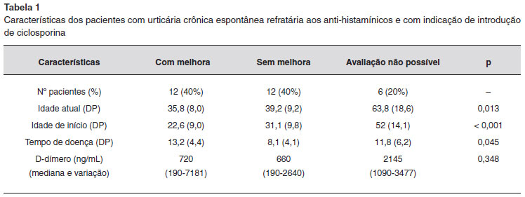 Trinta pacientes com UCE refratária aos antihistamínicos e com indicaçao de introduçao da ciclosporina foram incluídos no estudo. Desses pacientes, 80% eram do sexo feminino. A média de idade era de 42,8 anos (DP 15 anos), a da idade de início da urticária era de 31,9 anos (DP 14,6 anos), e a do tempo de doença de 10,9 anos (DP 5 anos). Previamente à indicaçao da ciclosporina, vários outros medicamentos foram utilizados para controle da urticária: AH1 de 1ª geraçao (80%), AH2 (60%), montelucaste (66,7%), hidroxicloroquina (33,3%) e/ou corticoide oral (56,7%). Nenhum paciente estava em uso de dapsona no período de estudo.