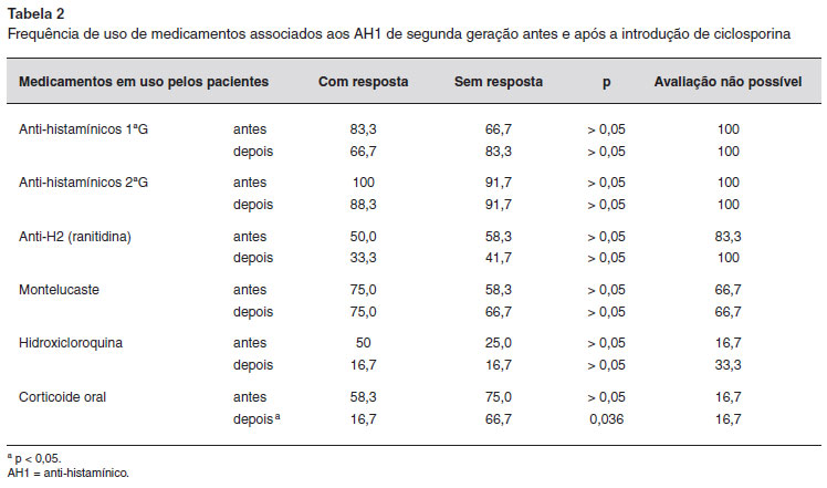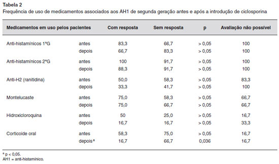 Todos os pacientes estavam em uso de outros medicamentos associados aos AH1 2ªG, como AH1 1ªG, anti-H2 (AH2), montelucaste, hidroxicloroquina, com o objetivo de controlar os sintomas da urticária. Muitos eram corticodependentes. A ciclosporina foi indicada para todos os pacientes que se mantiveram sintomáticos, apesar do uso destes medicamentos.