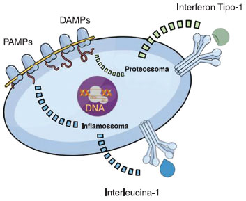 A plataforma mais famosa e bem estuda responsável pela inflamaçao nas doenças autoinflamatórias é o inflamossoma, que é constituído tipicamente por: (1) proteína temporária típica; (2) molécula adaptadora pequena ASC (apoptosis associated speck-like protein contendo um domíneo CARD); e (3) a forma progenitora da enzima caspase-1 (pró-caspase1), que participa da síntese das interleucinas inflamatórias e que consequentemente ativam as células T e B25.
