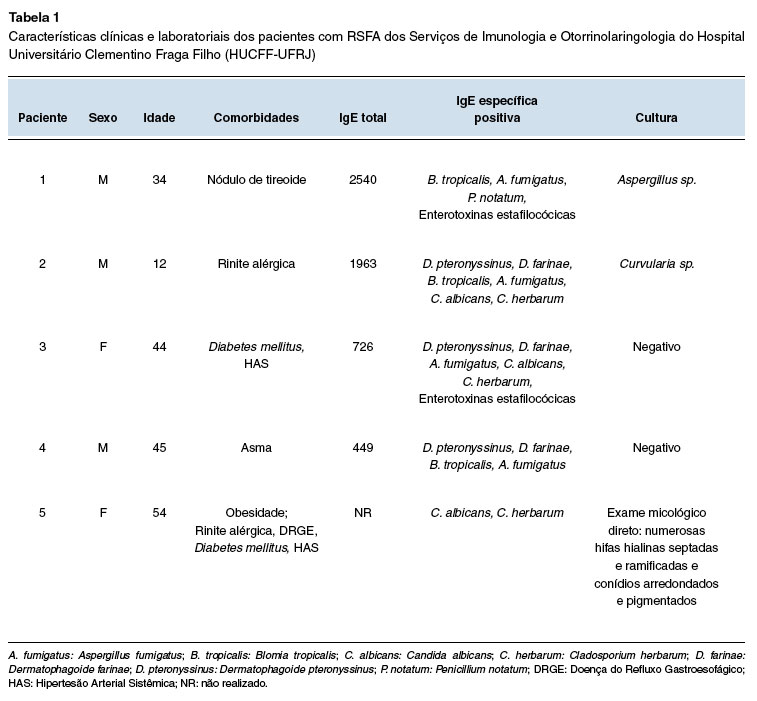 Foram incluídos 5 pacientes com RSFA, sendo 3 masculinos e 2 femininos. A mediana da idade foi 44 anos (12-54 anos). As comorbidades associadas identificadas foram: rinite alérgica (2), hipertensão arterial sistêmica (2), diabetes mellitus tipo 2 (2), asma (1), nódulo tireoidiano (1), obesidade (1) e doença do refluxo gastroesofágico (1). A média da IgE sérica total foi 1.419,5 UI/mL. Todos os pacientes apresentavam sensibilização para pelo menos um fungo, sendo: A. fumigatus (4), C. albicans (3), C. herbarum (3), e P notatum (1). Havia também sensibilização para outros aeroalérnegos: B. Tropicalis (3), D. Pteronyssinus (3), D. Farinae (3); e Enterotoxinas estafilocócicas (2). Os achados tomográficos mais frequentes foram lesões expansivas com afilamento ósseo. Com relação à cultura para fungos, somente dois pacientes apresentaram positividade, sendo identificados Aspergillus sp. e Curvularia sp. Em uma paciente identificou-se, no exame micológico direto, numerosas hifas hialinas septadas e ramificadas e conídios arredondados e pigmentados. (Tabela 1).